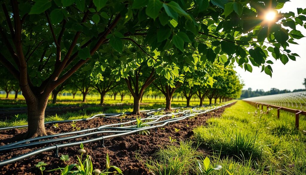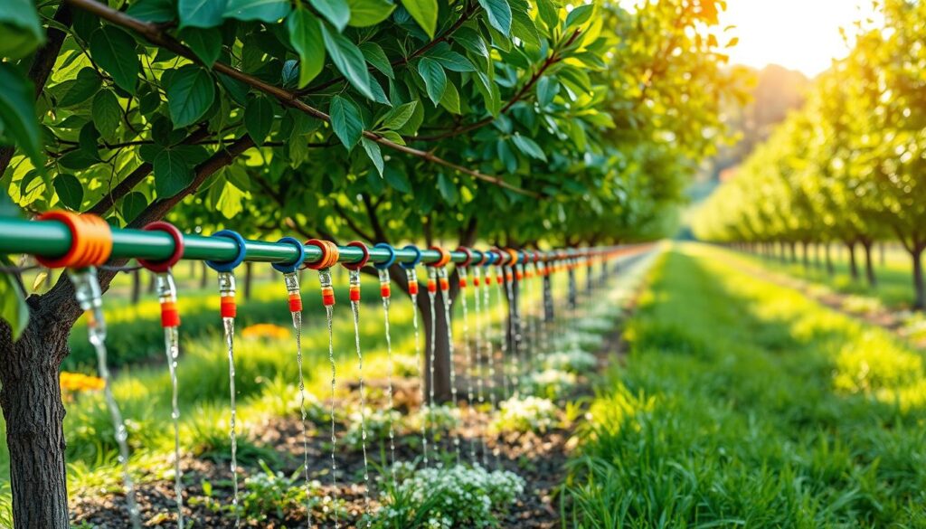 Drip irrigation uses small tubes or pipes to water plants at their base slowly. This method stops water from running off or evaporating too fast. It’s great for keeping trees healthy and growing well.