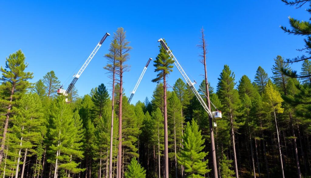 Tree cranes also offer forestry techniques that traditional methods can’t match. They use their strength to adjust the tree’s fall path. This is super useful in selective logging, where only certain trees are cut.